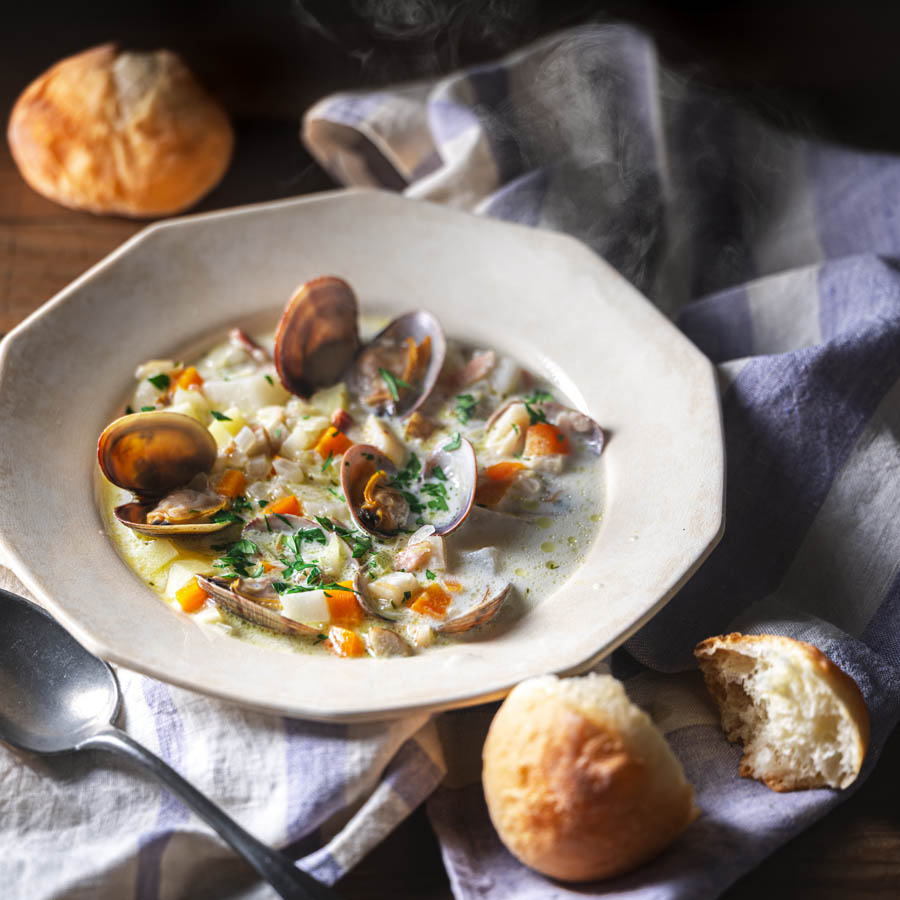 秋冬の根菜をじっくり煮込んだクラムチャウダーは滋味深く、パンの夕食にぴったり。