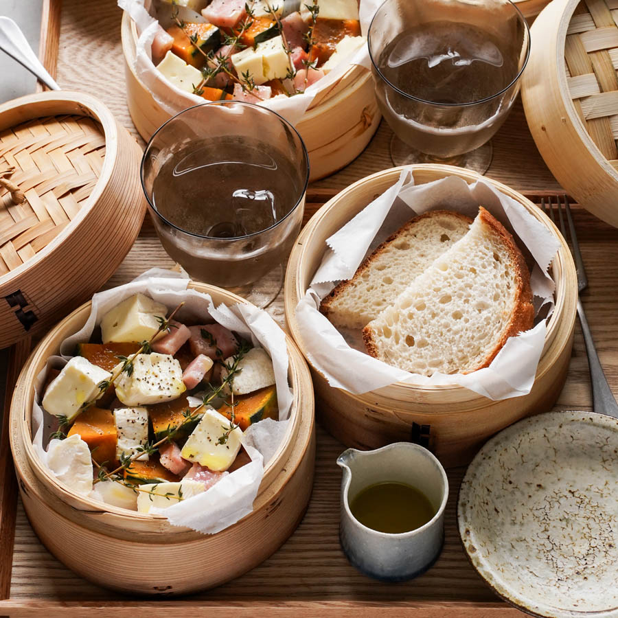 せいろを使って主菜とパンを一緒に蒸すメニューは、パンもふんわりもっちり楽しめ、